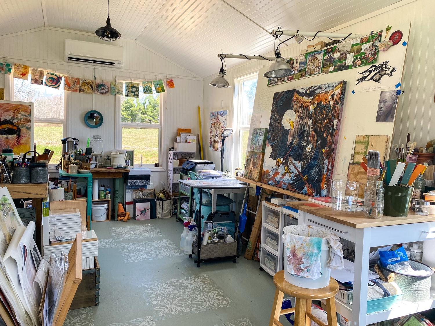 My work studio is a simple Mennonite shed, 12x28, a mere 336 square feet, which I finished and filled with the colors and textures of my soul.